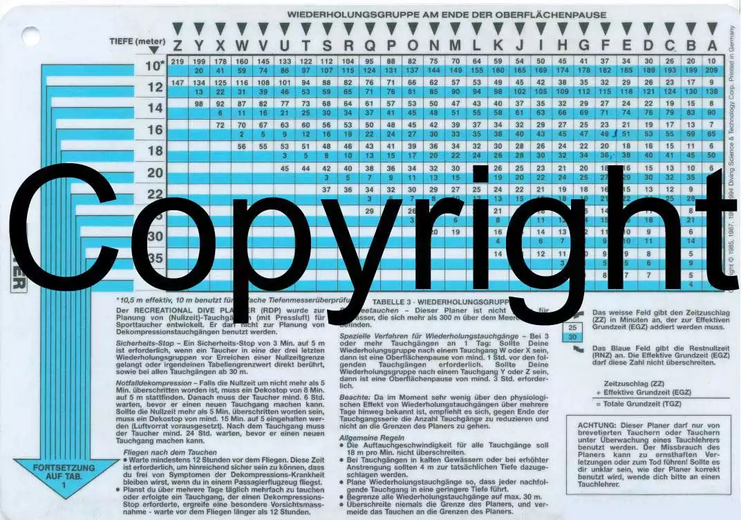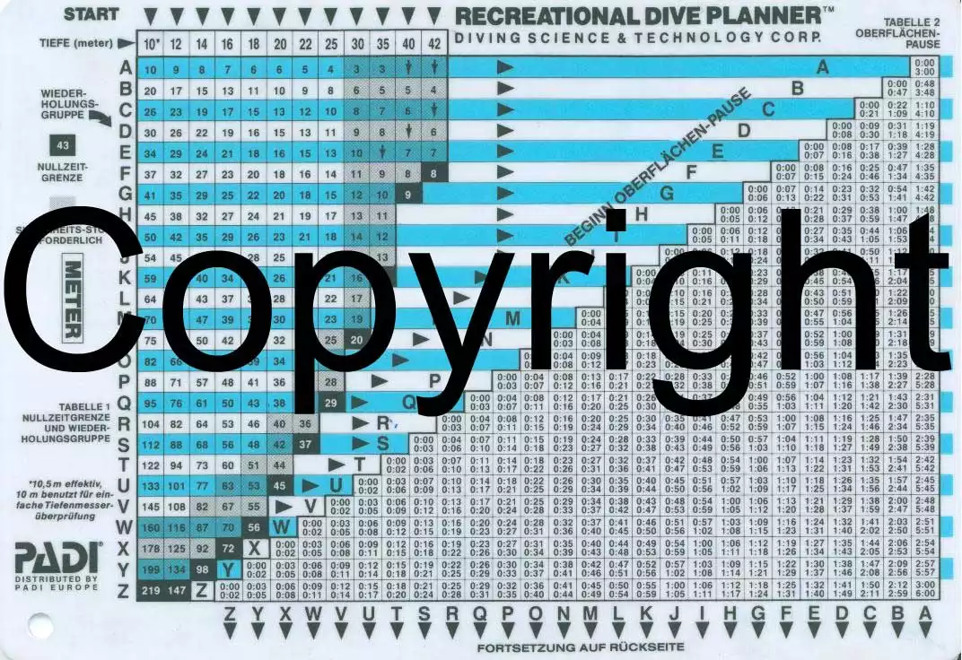 Der Recreational Dive Planner steht unter Copyright von PADI, er kann z.B. hier bestellt werden: PADI